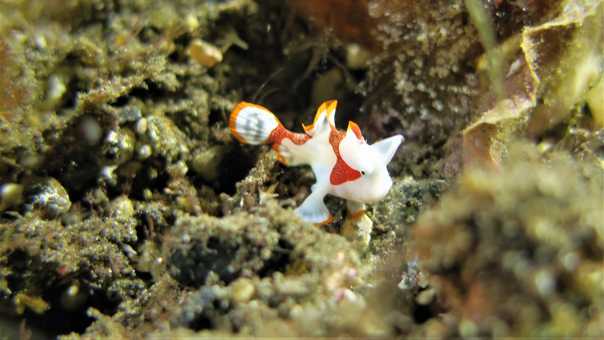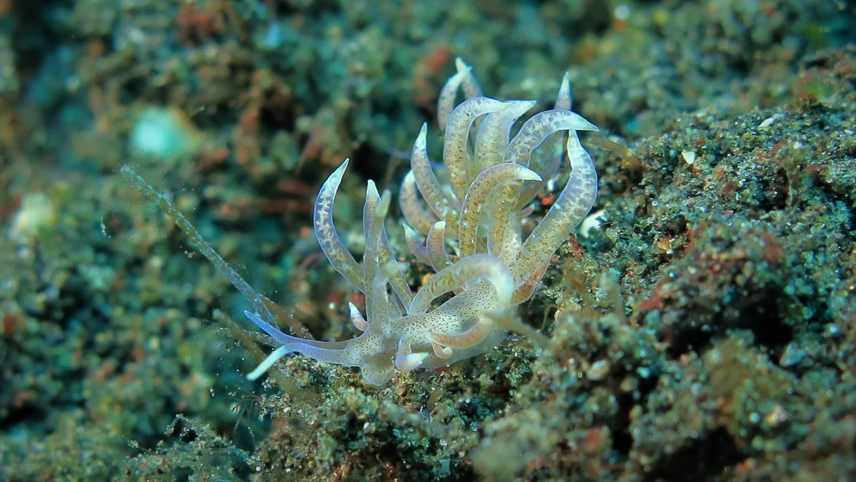 Terwijl ik langzaam over de bodem zweefde, zag ik iets kleins bewegen tussen het zand: een piepkleine zeenaaktslak, nauwelijks groter dan een speldenknop.